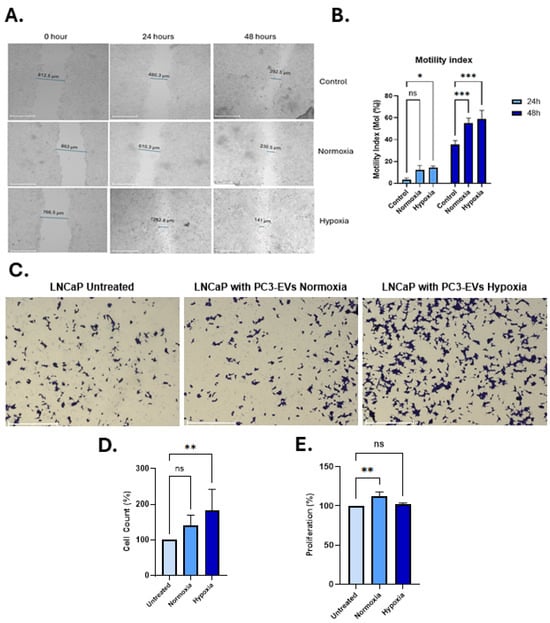 PC3 hypoxia-derived EVs enhance migration and invasion of LNCaP cells. (A) Representative wound-healing assay images at 0, 24, and 48 h for untreated cells, and cells treated with PC3 normoxia- or hypoxia-EVs. (B) Motility Index quantification shows significantly greater wound closure with hypoxia-EVs at 24 h and 48 h (n = 3). (C) Representative transwell invasion assay images under the same treatment conditions. (D) Quantification confirms significantly increased invasion with hypoxia-EVs versus normoxia-EVs or untreated controls. (E) MTT assay revealed no significant proliferation differences, indicating that increased invasion is independent of proliferation. Data analysed using two-way ANOVA followed by Šídák’s test. n = 3, * p < 0.05, ** p < 0.01, *** p < 0.001, ns = not significant; error bars indicate SD.