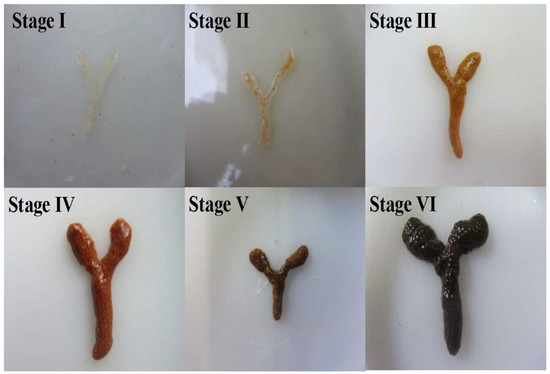 | Stage II | Pale yellow | Filamentous structure containing minute oocytes visible macroscopically; oocytes exhibit blurred boundaries and remain inseparable | [34] |