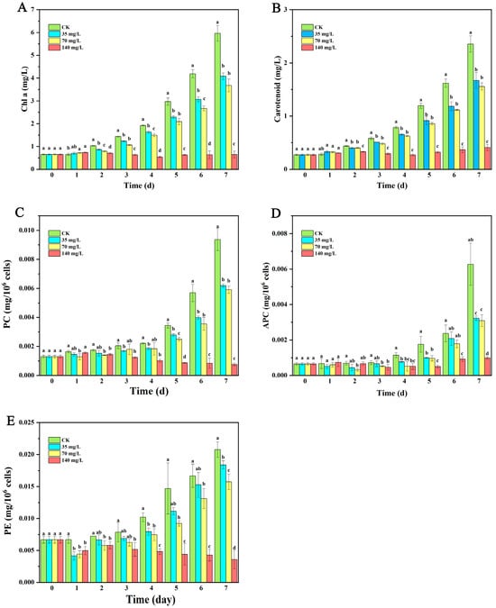 3.2. Influence of DE on Photosynthetic Pigment Contents in M. aeruginosa Cells