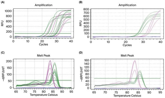 Figure 1. Establishment of sheep blood ultra-trace gDNA amplification system. Note: (A) Amplification curves at dilution factors of 10, 100, 1000, 10,000, and 20,000 times; (B) melting curves corresponding to the same dilution factors; (C) validation results for the qPCR amplification curve at the maximum dilution factor of 20,000 times; (D) validation results for the qPCR melting curve at the same maximum dilution factor. The green curve represents the GAPDH gene, the pink curve represents the SRY gene, and the blue curve indicates the blank control group. In addition, the Y-axis RFU represents the Relative Fluorescence Unit, while -d(RFU)/dT indicates the rate of change of the fluorescence signal concerning temperature.