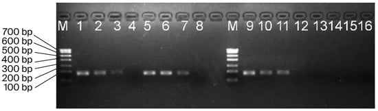 Figure 2. Gradient-diluted gDNA detected through agarose gel electrophoresis. Note: The dilution multiples are 10/100/1000, and lane M is the DNA marker. The gDNA electrophoresis results for male sheep are as follows: lanes 1/2/3 are the GAPDH gene; lanes 5/6/7 are the SRY gene; the gDNA electrophoresis results for female sheep are as follows: lanes 9/10/11 are the GAPDH gene; lanes 13/14/15 are the SRY gene. Lanes 4/8/12/16 are the blank controls.