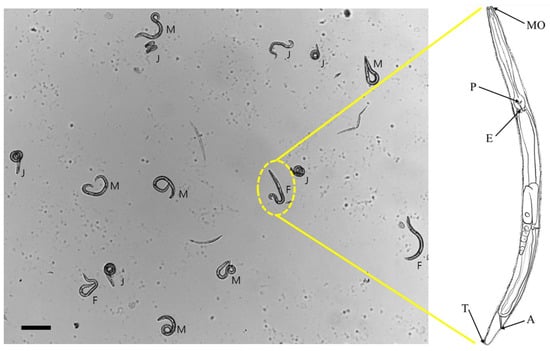 Nematode identification using morphological characteristics. Anatomical illustration of a nematode, highlighting key structures: mouth (‘MO’), esophagus (‘E’), pharynx (‘P’), tail (‘T’), and anus (‘A’). Juveniles (‘J’) are distinct from reproductive adults, which have ovary for females (‘F’) and testis for males (‘M’). Scale bar represents 100 μm.
