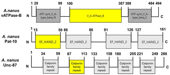 Two structural genes, Pat-10 and Unc-87, are essential for nematode survival and movement and their RNAi led to significant mortalities in C. elegans and plant parasitic nematode [27]. In addition, vATPase-B is a gene encoding a catalytic subunit (Figure 3) of the enzyme, which actively transports proton to the lumen of the midgut for the digested nutrients to be absorbed and is crucial for survival for several insects [25,28]. These three genes were retrieved from A. nanus genome and confirmed by Blast search to the GenBank (Table 3).