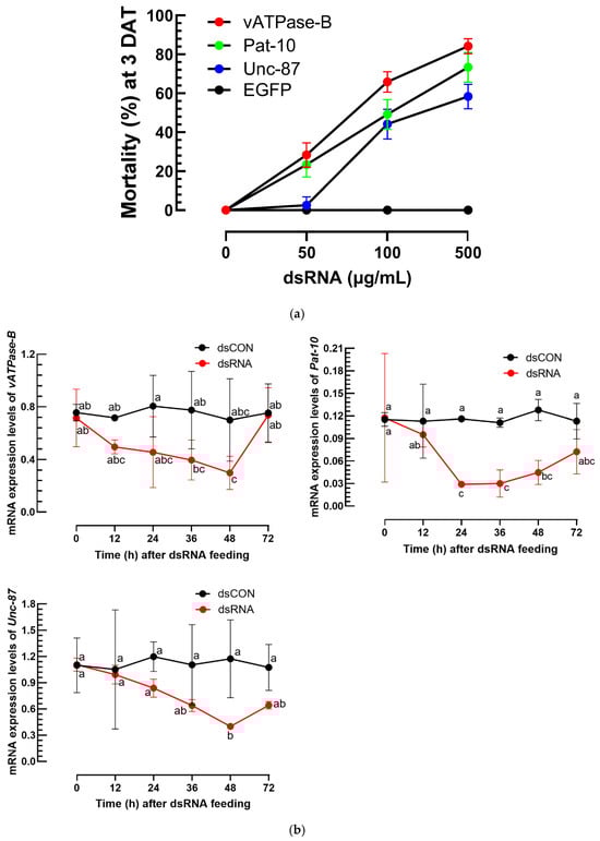 Efficacy of dsRNA application against A. nanus using an agar plate assay. (a) Nematode susceptibility to three different dsRNAs at different doses. EGFP was used as a control for a non-target gene. Mortality (%) was assessed 3 days after treatment (‘DAT’). Each plate contained 40 nematodes (a mixture of larvae and adults) and was replicated three times. Median lethal concentrations were estimated and shown in Table S3. (b) Quantification of target gene expression levels after the RNAi treatments, where expression levels were normalized using an elongation factor, EF1α, for A. nanus. Control (‘dsCON’) utilized dsRNA specific to a green fluorescence protein gene, EGFP, serving as a non-target gene. Data represent mean ± standard deviation from three biological replicates. Different letters at the dots indicate significant difference among means at Type I error = 0.05 (LSD test).