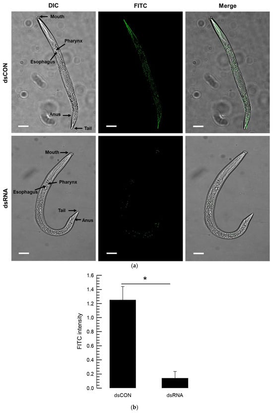 This study tested the hypothesis that nematodes can be controlled via environmental application of dsRNA. A model nematode for this study used A. nanus, which were identified by morphological and molecular characteristics. Even though A. nanus is not a pest but rather a decomposer in the ecosystem, it is an ideal nematode species for developing a novel control agent using RNAi due to its well-known gene expression system [29,30]. In particular, its habitat in soil allowed us to test dsRNA application in soil using a chitosan formulation. This would be necessary to develop dsRNA to kill nematodes, which cause serious economic damage to crops because several nematodes such as root-knot nematodes, root lesion nematodes, or cyst nematodes live in soil environments. The isolate used in this study was collected from an agricultural farm cultivating cucumber. In contrast, the first report of this species in Korea was isolated in the soil collected from a potato farm [31]. This explains its habitats in a wide range of terrestrial areas, including forests, sand dunes, and agricultural farms [32].
