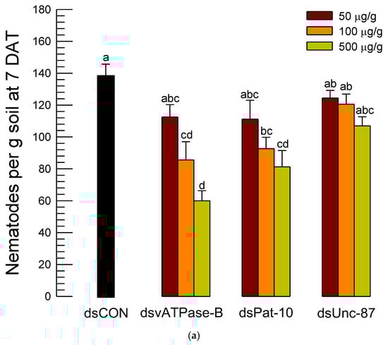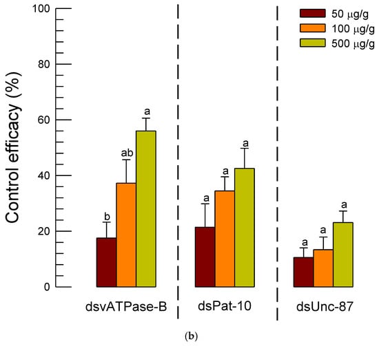 To be practical for the dsRNA control against the soil nematode, the infective juveniles were applied to soil along with dsRNA (Figure 7). After 7 days, the nematodes in the treated soil were collected and assessed in the control efficacies of the three different dsRNA treatments. Unlike in the microplate assay, the dsRNAs specific to Unc-87 or Pat-10 gave low control efficacies below 40% and did not exhibit significant dose-dependent mortality against A. nanus (Figure 7a). In contrast, the dsRNA treatment specific to vATPase-B gave significant dose-dependent mortalities to the nematodes, in which dsRNA specific to vATPase-B achieved approximately 57% control efficacy at 500 µg/g (Figure 7b).