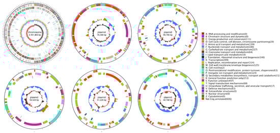 WGS of Lp. plantarum FRT4 revealed a genome size of 3,449,239 base pairs (bps), with a guanine–cytosine (G+C) content of 44.27%. The circular genome map is presented in Figure 1. The genome consists of one circular chromosome and five plasmids, with sizes of 3,161,469 bp, 74,388 bp, 66,780 bp, 54,628 bp, 51,226 bp, and 40,748 bp, respectively. The plasmids contain genes involved in diverse functional categories, such as carbohydrate metabolism, replication and repair, and membrane transport, suggesting their potential roles in environmental adaptation and horizontal gene transfer. A total of 3301 protein-coding genes were predicted, spanning a cumulative length of 2,895,105 bp, accounting for 83.93% of the entire genome. The average gene length was 877 bp, with the longest gene measuring 5814 bp and the shortest 93 bp. Additionally, the genome contains 73 tRNA genes, 5 copies each of 23S rRNA and 16S rRNA, 6 copies of 5S rRNA, 15 CRISPR arrays, 14 genomic islands, 2 prophage regions, and 3 gene clusters.