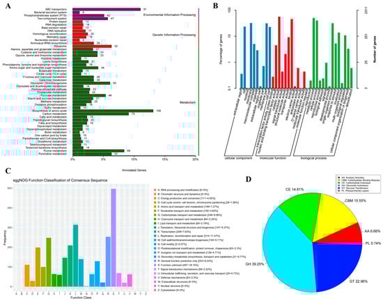 Functional annotation of WGS of Lp. plantarum FRT4. (A) KEGG functional annotation analysis. (B) GO database functional annotation analysis. (C) eggNOG database functional annotation analysis. (D) CAZy database functional annotation analysis.