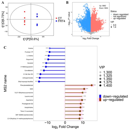 Volcano plot analysis identified a total of 11,466 significantly altered metabolites between the FRT4 and CT groups (VIP > 1, p < 0.05), of which 5862 were upregulated and 5604 were downregulated in the FRT4 group (Figure 3B). These results indicate a broad metabolic reprogramming during FRT4 fermentation.
