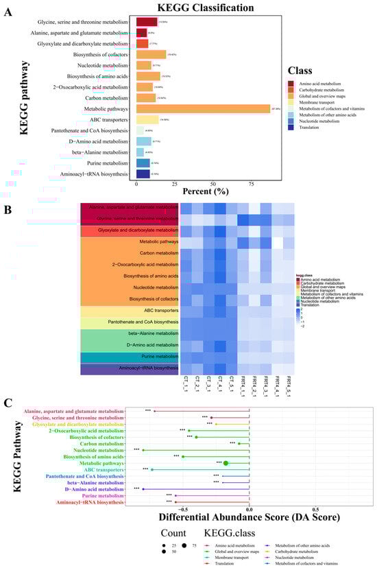 KEGG pathway analysis of the fermentation supernatant of Lp. plantarum FRT4. (A) KEGG pathway classification. (B) KEGG pathway heatmap. (C) KEGG DA score plot. N = 5 per group. *** p < 0.001.