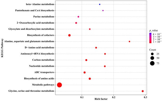 To further assess the enrichment and statistical significance of KEGG pathways, a KEGG enrichment bubble plot was generated (Figure 5). The results revealed that the “metabolic pathways” category contained the largest number of differential metabolites and showed significant enrichment; “glycine, serine and threonine metabolism pathway” exhibited the highest enrichment factor, indicating it was most strongly affected by fermentation. Other highly enriched and statistically significant pathways included “biosynthesis of amino acids”, “D-amino acid metabolism”, “alanine, aspartate and glutamate metabolism”, “pantothenate and CoA biosynthesis”, “glyoxylate and dicarboxylate metabolism”, and “biosynthesis of cofactors”, highlighting their important roles in FRT4-mediated metabolic regulation.