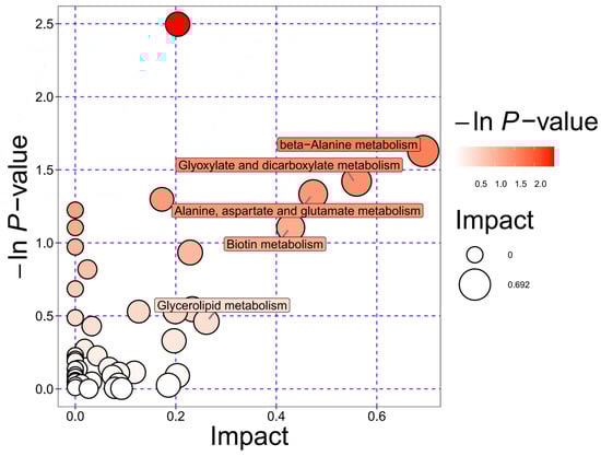 Furthermore, a topological bubble plot was constructed to evaluate the functional importance of differential metabolites within each pathway (Figure 6). The x-axis represents the pathway impact value, reflecting the centrality of the altered metabolites within the metabolic network, while the y-axis indicates the statistical significance of enrichment. The results showed that “beta-alanine metabolism”, “glyoxylate and dicarboxylate metabolism”, and “alanine, aspartate and glutamate metabolism” showed significant enrichment and high impact values, suggesting that critical nodes within these pathways were significantly regulated and may play central roles in the metabolic remodeling induced by FRT4 fermentation.