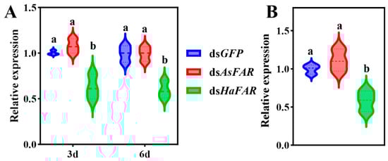 Changes in FAR gene expression in larvae and adults of H. axyridis after feeding on three dsRNAs. (A) Changes in FAR gene expression in larvae of H. axyridis after feeding on three dsRNAs for 3 d and 6 d (F3d (2, 6) = 20.65, P3d = 0.0020; F6d (2, 6) = 19.83 P6d = 0.0023). (B) Changes in FAR gene expression in adults of H. axyridis after feeding three dsRNAs for 3 d (F (2, 6) = 16.25, p = 0.0038). The values are represented as mean ± SD of three replicates. Error bars indicate the standard error of the mean. Different lowercase letters (a, b) indicated significant differences (p-value < 0.05). p-Values are based on multiple comparisons that were performed using one-way ANOVA followed by Tukey’s multiple comparison tests.