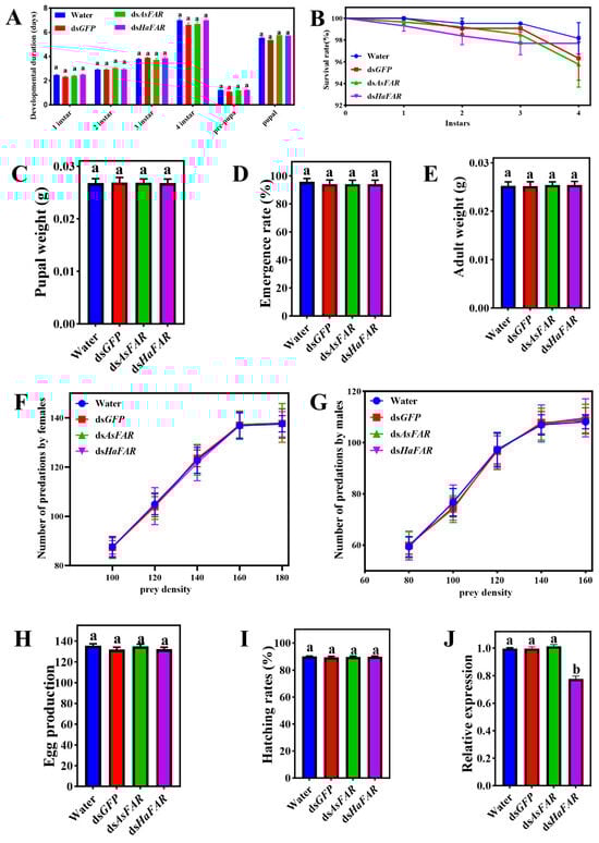 Evaluation of RNA interference of FAR in H. axyridis. Duration of the pre-imaginal stages (A), survival rates (B), pupal weight (F1 instar (3, 282) = 1.85, P1 instar = 0.14; F2 instar (3, 278) = 0.6440, P2 instar = 0.5873; F3 instar (3, 276) = 0.67, P4 instar = 0.5719; F4 instar (3, 268) = 1.556, Ppre-pura = 0.2004; Fpre-pura (3, 268) = 1.533, Ppupal = 0.2063 F (3, 253) = 1.551, p = 0.2019) (C), emergence rate (F (3, 268) = 0.28, p = 0.84) (D), adult weight (F (3, 268) = 0.09, p = 0.97) (E), number of predations by females (F), number of predations by males (G), egg production (F (3, 56) = 0.77, p = 0.51) (H), and hatching rates (F (3, 268) = 0.28, p = 0.84) (I) for populations from all treatments. (J) Changes in FAR expression after feeding dsRNA-mixed artificial diets in H. axyridis (F (3, 8) = 209.14, p = 6.15 × 10−8). The values are represented as mean ± SD of three replicates. Error bars indicate the standard error of the mean. Different lowercase letters (a, b) indicate significant differences (p-value < 0.05). p-Values are based on multiple comparisons that were performed using one-way ANOVA followed by Tukey’s multiple comparison tests.