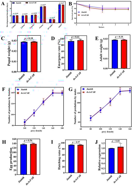 Life-table parameters of H. axyridis through the trophic transfer assay. Duration of the pre-imaginal stages (df1 instar = 82, df2 instar = 80, df3 instar = 80, df4 instar = 80, dfpre-pura = 80, dfpupal = 75) (A), survival rates (B), pupal weight (df = 80) (C), emergence rate (df = 80) (D), adult weight (df = 80) (E), number of predations by females (F), number of predations by males (G), egg production (df = 28) (H), and hatching rates (df = 28) (I) of H. axyridis after feeding on aphids that were reared on dsAsFAR and jin668 cottons (df = 28). (J) Changes in FAR expression after feeding on Jin668 and dsAsFAR cotton in H. axyridis (df = 4). The values are represented as mean ± SD of three replicates. Error bars indicate the standard error of the mean. Each group was compared by Student’s t-test.