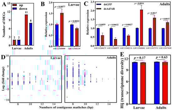 Transcriptome entropy for evaluating siRNA off-effects. Quantitative count of DEGs (A) for transcriptome sequencing and qRT-PCR validation for O. similis larvae (df = 4) (B) and adults (df = 4) (C). (D) The number of base pairs matched is linked with their fold changes for each continuous matched gene. Red, upregulated genes; blue, downregulated genes; gray, no significant genes. (E) The effect of siRNA feed on the Shannon transcriptome entropy (df = 4). The values are represented as mean ± SD of three replicates. Error bars indicate the standard error of the mean. Each group was compared by Student’s t-test.
