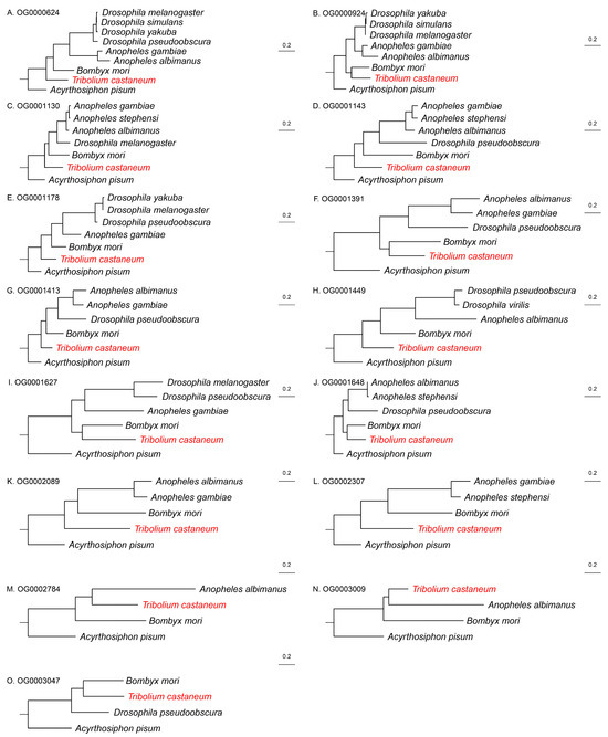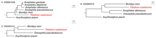 3.5. Functional Analysis of Three Orthogroups with Accelerated Evolution in T. castaneum