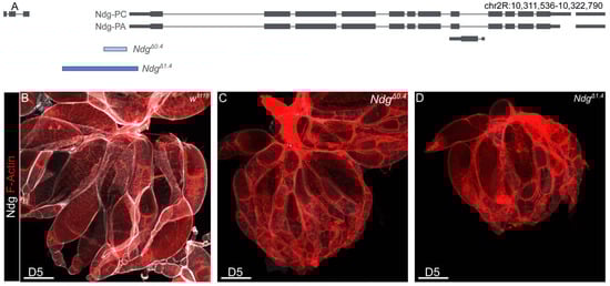 Ndg is one of the major components of the BM. The loss of Ndg reveals roles in BM stability, barrier function, and nervous system patterning, although Ndg null mutants are viable [7]. To investigate a potential role of Ndg for Drosophila fertility, we used our previously generated NdgΔ0.4 and NdgΔ1.4 mutants (Figure 1A) [7]. Immunohistochemical analysis of Drosophila embryos using a specific Ndg antibody, as well as Western blot analysis, revealed that NdgΔ0.4 is a hypomorphic allele, while NdgΔ1.4 is amorphic. This is attributed to the fact that the hypomorphic allele shows residual expression, whereas the amorphic alleles do not [7,35]. To test if Ndg antibody staining of the ovary led to similar results, we repeated this experiment. We stained the ovaries of 5-day old w1118 control flies as well as NdgΔ0.4 and NdgΔ1.4 mutants and co-stained the ovary with F-actin, which allows us to show muscles and discriminate between different stages of egg chamber development (Figure 1B–D’). In control flies, we observed prominently Ndg localization in BMs of the muscle sheets as well as of the epithelial follicle cells of the egg chambers (Figure 1B,B’). In NdgΔ0.4, only a small amount of Ndg can be detected in the BM (Figure 1C,C’), while the specific Ndg signal was abolished in the NdgΔ1.4 mutants (Figure 1D,D’). Ndg is known to ensure proper fertility in C. elegans [13]. To test if the loss of Ndg affects female fertility, we quantified the percentage of non-fertilized eggs with progressive age over time from day 5 to day 13 (Figure 1E). During this period, the number of unfertilized eggs in the control group also began to increase slightly (Figure 1E). While in 5-day old flies, NdgΔ1.4 mutants showed a significantly higher percentage of non-fertilized eggs compared to controls (by ∼6.4% and ∼19.2%, respectively), while NdgΔ0.4 mutants did not (∼7%); furthermore, 7- to 13-day-old females showed significant differences between controls compared to both Ndg mutants alleles (listed in the order of controls, NdgΔ0.4, and NdgΔ1.4: ∼8%, ∼17%, and ∼33% for 7-day-old flies, ∼11%, ∼25%, and ∼49% for 9-day-old flies, ∼17%, ∼28%, and ∼59% for 11-day-old flies, ∼18%, ∼46%, and ∼71% for 13-day-old flies) (Figure 1E). Thus, a reduction in Ndg protein levels affects female fertility with higher effects in older flies.