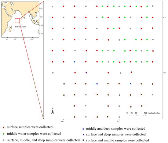 We conducted water sampling from 14 December 2023 to 2 February 2024. The survey area covered the Western Indian Ocean (58° E–68° E, 5° S–6° N), with a total of 130 survey stations (Figure 1). The total coverage area of all station positions is approximately 396,000 nmi2, with adjacent stations spaced about 15 nmi apart. Out of the 130 stations, 34 stations were sampled for surface (with the depth of 0 m), middle layer (100 m), and deep (300 m) water samples; 66 stations were sampled only for surface water; and 30 stations were sampled only for middle layer water. Thus, a total of 198 water samples were collected. Due to the large sample size in this study, sample duplication was not set in this study.