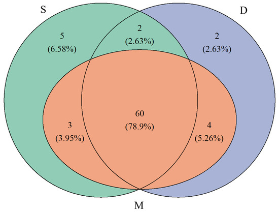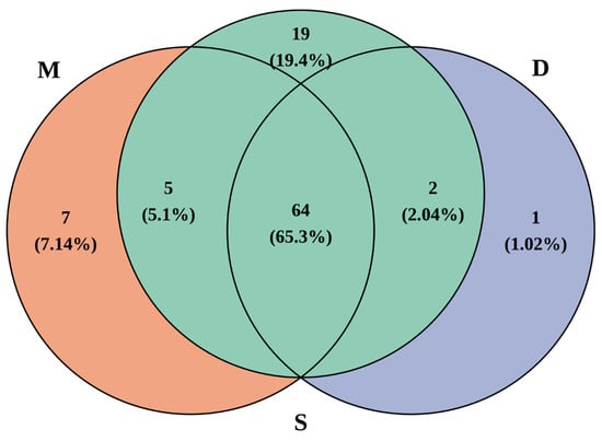 Venn diagram of species detected in different water layers (S represents surface water, M represents middle water, D represents deep water).