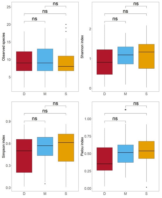 The distributions of observed species, Shannon index, Simpson index, and Pielou index for different water layers of 28 stations (S indicates surface water; M indicates middle water; D indicates deep water; ns indicates no significant difference; an asterisk (*) indicates a significant difference with p < 0.05).
