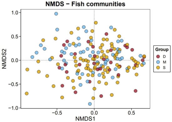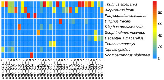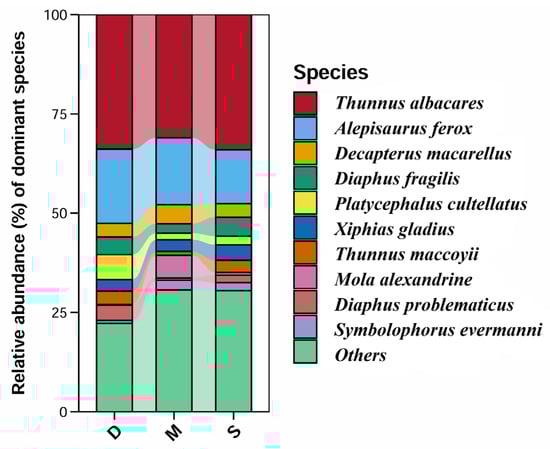 The raw reads were filtered by Trimmomatic [22] to remove lower-quality reads, such as those less than 50 bp in length and those with a tail quality of less than 20 bases. Pairs of reads were merged into a sequence using FLASH (v1.2.10) [23] based on the overlap (with a minimum length of 10 bp) relationship between raw reads. Chimeras were removed by a combination of de novo and reference sequences using Usearch (v6.1.544) software and the gold database, and primers were removed using Cutadapt (v4.0) (https://cutadapt.readthedocs.io/ (accessed on 1 May 2024)). QIIME2 (2020.11) software was utilized for annotation screening and further analysis. Sequence denoising was performed following the QIIME2 DADA2 (v1.18.0) analysis process. The dereplicated sequence generated through dada2 quality control was considered an amplicon sequence variant (ASV) with default parameters [24,25]. Taxonomic classification of representative sequences from each ASV was performed against the National Center for Biotechnology Information (NCBI) GenBank database and Mitofish databases (http://mitofish.aori.u-tokyo.ac.jp/ (accessed on 1 May 2024)). Significant hits were defined as those with e-values ≤ 1 × 10−10, calculated using the BLASTn algorithm (v2.2.30). Marine fish species were identified from the taxonomic annotation results using the FishBase database (www.fishbase.org (accessed on 1 May 2024)), followed by removal of potential false positives. Specifically, species with read counts ≤ 5 in any individual sample were classified as false positives and excluded from downstream analyses by setting their abundance values to zero. Subsequent analyses were performed on this filtered dataset.