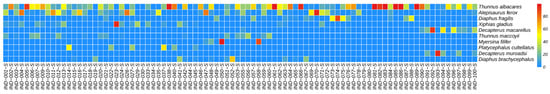 After quality control and de-duplication, the number of ASVs generated by sequences was 202,230, of which 65,794 ASVs were annotated to species. The initial number of fish species annotated was 296. After further removal of freshwater fish species and false positive species, the final number of annotated marine fish species is 98. These species belong to one phylum (Chordata), two classes (Actinopterygii and Chondrichthyes), 20 orders, 35 families, and 60 genera (Table 1).