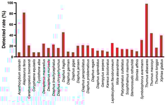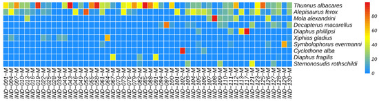 Other economically important fish species with relatively high abundance detected in this study include X. gladius, D. macarellus, T. maccoyii, and P. cultellatus. However, there is some difference between the economic species types and their relative abundance rankings found in this study compared to the fishery catch data. The potential reasons for this discrepancy are varied, with the primary reason being that the sampling area in this study is limited to the oceanic region of the Western Indian Ocean.