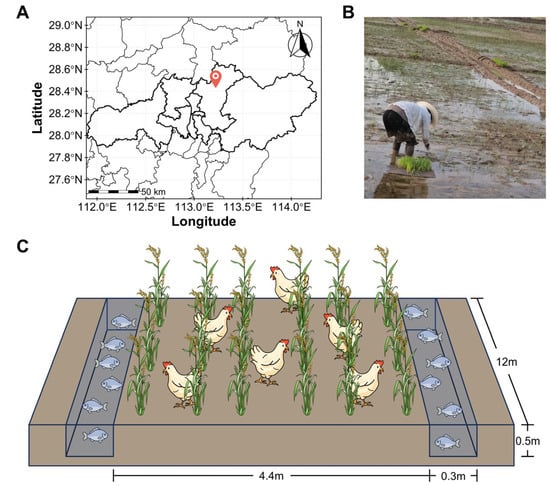 The experiment was conducted during the 2021 rice growing season at a specialized rice-poultry-fish integrated farm located in Changsha County, Hunan Province, China (113°13′09″ E, 28°24′48″ N; Figure 1A,B). The experimental soil was classified as reddish clayey paddy soil with the initial properties listed in Table 1.