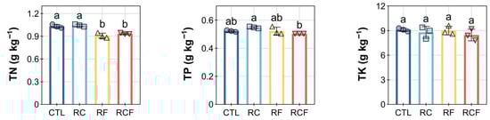 Critically, these shifts in available nutrients occurred despite limited variation in total nutrient pools. TN remained statistically similar in CTL (1.03 ± 0.25 g kg−1) and RC (1.04 ± 0.02 g kg−1), while RF (0.91 ± 0.03 g kg−1) and RCF (0.94 ± 0.01 g kg−1) showed significant reductions (Figure 2). TP was highest in RC (0.55 ± 0.01 g kg−1) but depressed in RCF (0.50 ± 0.02 g kg−1), and TK showed no significant treatment differences despite stark contrasts in AK availability (Figure 2), collectively indicating that cropping systems predominantly influenced nutrient mobilization processes rather than total reserves.