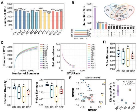 A total of 2,132,444 high-quality reads were generated from 12 sequencing libraries, resulting in an average of 28,201 reads per sample. These sequences were clustered into OTUs, yielding 13,610 OTUs. OTU counts per sample ranged from 3735 (RF3) to 4582 (RF1), with a mean of 4190 (Figure 3A). Among all OTUs, 942, 822, 896, and 812 were unique to CTL, RC, RF, and RCF, respectively, while 3375 OTUs were shared among all systems (Figure 3B), indicating both commonality and system-specific microbial constituents.
