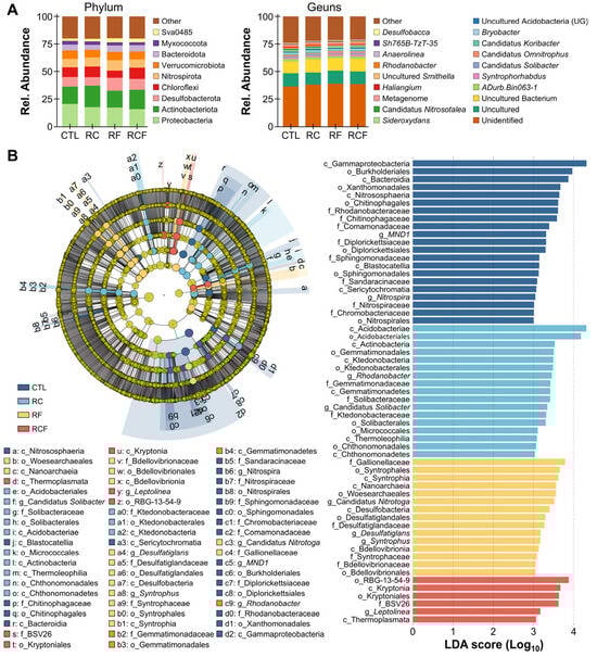 The soil bacterial community was dominated (>5% relative abundance) by Proteobacteria (CTL: 20.39%, RC: 17.44%, RF: 17.12%, RCF: 15.79%), Acidobacteriota (CTL: 15.87%, RC: 19.67%, RF: 15.32%, RCF: 17.57%), Desulfobacterota (CTL: 8.57%, RC: 7.58%, RF: 11.72%, RCF: 9.73%), Chloroflexi (CTL: 8.87%, RC: 9.71%, RF: 6.49%, RCF: 10.29%), Nitrospirota (CTL: 7.53%, RC: 8.19%, RF: 9.39%, RCF: 7.39%), and Verrucomicrobiota (CTL: 7.77%, RC: 6.97%, RF: 7.63%, RCF: 7.31%) at the phylum level (Figure 4A). Dominant genera (>1% relative abundance) included Unidentified (CTL: 36.39%, RC: 38.00%, RF: 38.72%, RCF: 38.39%), Uncultured (CTL: 11.88%, RC: 10.93%, RF: 11.96%, RCF: 11.54%), Uncultured bacterium (CTL: 10.72%, RC: 11.78%, RF: 11.25%, RCF: 11.42%), ADurb.Bin063-1 (CTL: 2.10%, RC: 2.15%, RF: 1.80%, RCF: 2.12%), Syntrophorhabdus (CTL: 1.29%, RC: 1.21%, RF: 1.73%, RCF: 1.73%), and Candidatus Solibacter (CTL: 1.24%, RC: 1.65%, RF: 1.14%, RCF: 1.50%) (Figure 4A). LEfSe analysis identified system-specific biomarker taxa (LDA score ≥ 3, p < 0.05), showing that MND1 and Nitrospira were enriched in CTL, with enrichment of Rhodanobacter and Candidatus Solibacter in RC, Candidatus Nitrotoga, Desulfatiglans, and Syntrophus in RF, and Leptolinea in RCF (Figure 4B). These results indicate that each co-culture system fostered a distinct microbial assemblage, likely driven by differences in organic inputs, animal activities, and resultant biochemical conditions.