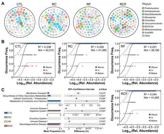 Co-occurrence network analysis elucidated species interactions among groups (Figure 5A). The CTL network comprised 79 nodes and 100 edges, dominated by Proteobacteria. The RF network consisted of 88 nodes and 120 edges, dominated by Proteobacteria as well. The RC (82 nodes, 102 edges) and RCF (95 nodes, 153 edges) networks showed Actinobacteriota dominance. Co-culture systems exhibited higher average connectivity than the conventional tillage, indicating more complex and cooperative species interactions. The neutral community model explained a minor fraction (R2 < 0.3) of microbial community variation (Figure 5B), suggesting that community assembly was predominantly governed by deterministic processes. PICRUSt2 functional prediction identified 37 dominant KEGG pathways associated with soil microbiota. Remarkable functional divergence was observed, primarily in metabolism-related pathways between CTL and RC and in disease-associated pathways between CTL and RF/RCF (Figure 5C).
