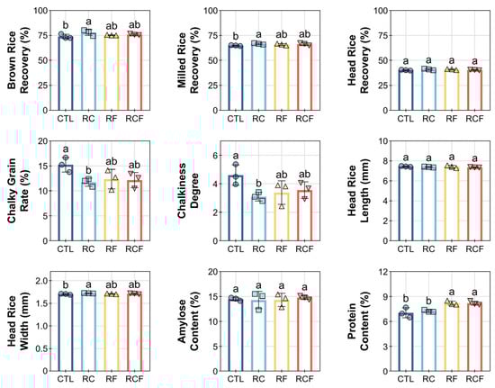 Figure 6. Effects of different ecological co-culture systems on rice grain quality. Distinct symbols (circles, square, triangles, and inverted triangles) represent different groups, and lowercase letters denote significant differences (ANOVA, Waller–Duncan post-hoc test, p < 0.05).