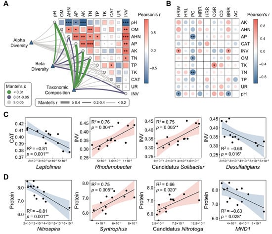 Figure 7. Integrative analysis of soil properties and grain quality relationships. (A) Mantel test evaluating associations between microbial communities and soil fertility parameters; (B) Heatmap illustrating pairwise Pearson correlations between soil fertility indices and grain quality traits; (C) Linear regression modeling relationships between differential taxa and enzyme activities; (D) Linear regression modeling relationships between differential taxa and key grain quality metrics. Statistical significance was set at * p < 0.05, ** p < 0.01, and *** p < 0.001 (Pearson correlation). Abbreviations: OM, organic matter; AHN, alkali-hydrolyzable nitrogen, AP, available phosphorus; AK, Available Potassium; TN, total nitrogen; TP, total phosphorus; TK, total potassium; CAT, catalase; UR, urease; INV, invertase; BRR, brown rice recovery; MRR, milled rice recovery; HRR, head rice recovery; CGR, chalky grain rate; CD, chalkiness degree; HRL, head rice length; HRW, head rice width; AC, amylose content; PC, protein content.