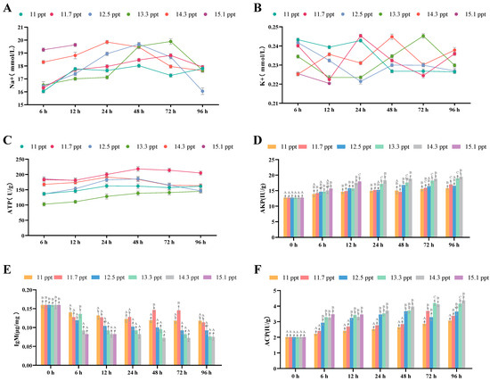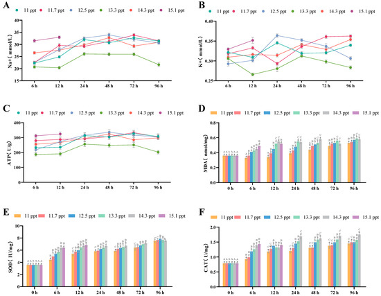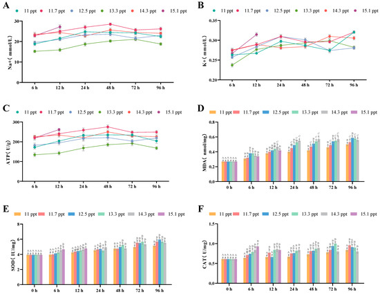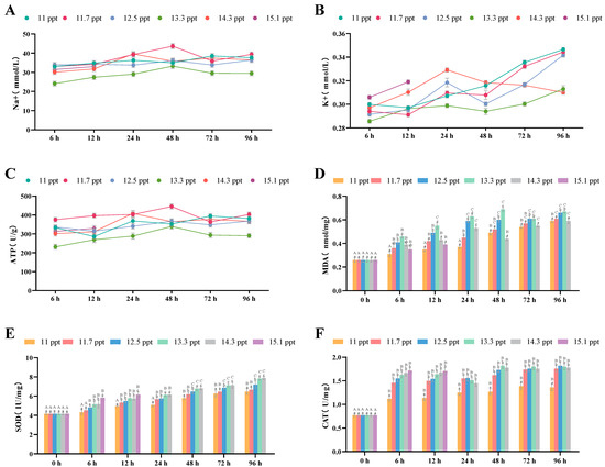 The effects of salinity stress on plasma osmoregulation and antioxidant system. (A–C): Na+ and K+ concentrations, ATP activity; (D–F): MDA content, SOD activity, CAT activity; different lowercase letters denote significant differences (p < 0.05) among different salinities at the same time point, while different uppercase letters indicate significant differences (p < 0.05) across different time points within the same salinity.