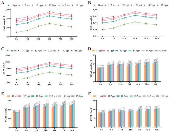 For plasma antioxidant indices, MDA (Figure 7D), SOD (Figure 7E), and CAT (Figure 7F) contents all showed a significant upward trend with increasing salinity (p < 0.05). Additionally, within 96 h, these three indices in all salinity groups significantly increased as stress time prolonged (p < 0.05).