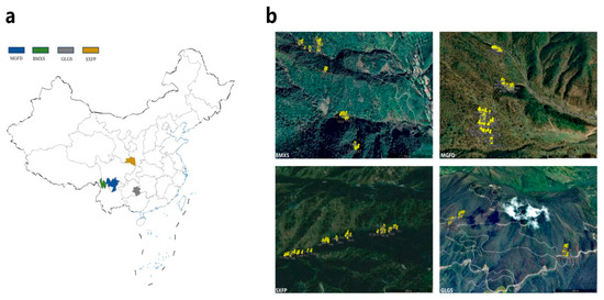 Location, patch, and distribution map of T. sinense individuals. (a) The sampling sites of the four populations were located in Sichuan Meigu Dafengding (MGFD), Yunnan Baima Snowshan Mountain (BMXS), Guizhou Leigong Mountain (GLGM), and Shanxi Foping (SXFP). (b) The distribution of T. sinense individuals in three different patches of the four populations. Yellow highlighting is used in the figure to distinguish the sampled individuals from each population.