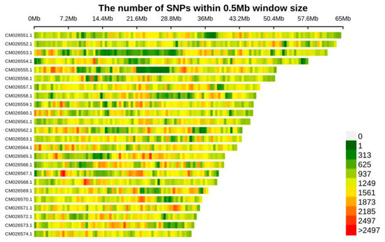 SNP distribution diagram on chromosome. CM026551.1 to CM026574.1 represent the numbering of chromosomes 1 through 24 of T. sinense, which has a diploid chromosome number of 48 (2n = 48).