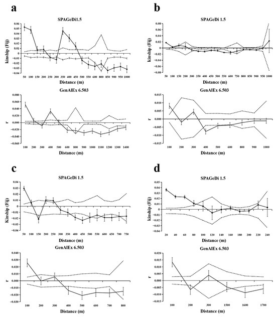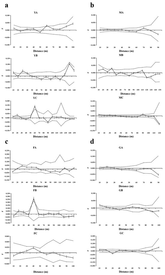 Spatial autocorrelation analysis of different patches of four populations. Solid lines represents genetic coefficients, with virtual lines represents 95% confidence interval and vertical lines represents standard errors. (a) SGS in the BMXS population; (b) SGS in the MGFD population; (c) SGS in the SXFP population; (d) SGS in the GLGS population.