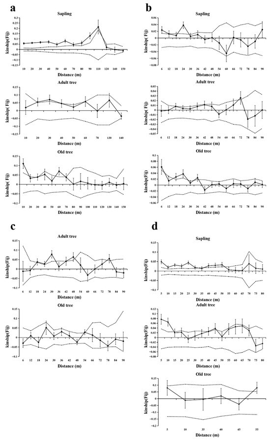 SGS analysis of different age−classes in four populations. Solid lines represents genetic coefficients, with virtual lines represents 95% confidence interval and vertical lines represents standard errors. (a) SGS in the BMXS population; (b) SGS in the MGFD population; (c) SGS in the SXFP population; (d) SGS in the GLGS population.