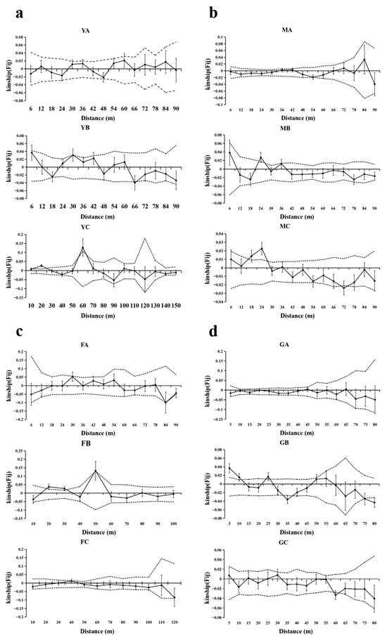 SGS of T. sinense in four populations. Solid lines represents genetic coefficients, with virtual lines represents 95% confidence interval and vertical lines represents standard errors. (a) SGS in the BMXS population; (b) SGS in the MGFD population; (c) SGS in the SXFP population; (d) SGS in the GLGS population.