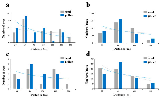 Propagation frequency of seeds and pollen in four populations. The blue line represents pollen, and the gray line represents seed. The dispersal rate of seeds and pollen decreased with the increase in distance between individuals. (a) SGS in the BMXS population; (b) SGS in the MGFD population; (c) SGS in the SXFP population; (d) SGS in the GLGS population.