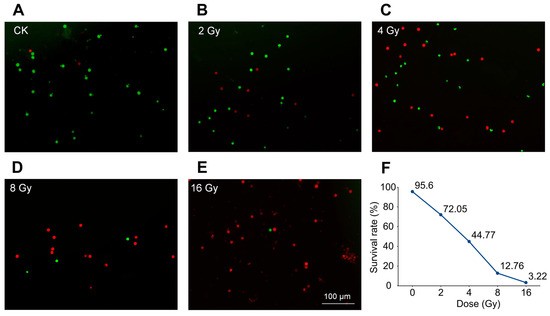 Pollen cell survival rate under different heavy ion irradiation doses. (A–E) The pollen survival rates at different doses, i.e., CK (0 Gy), 2 Gy, 4 Gy, 8 Gy, and 16 Gy, in which green indicates living cells, and red shows dead cells. (F) Dose survival regression curve.