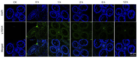 Spikelets at the 6–7 stage of young panicle differentiation were irradiated by heavy ions and fixed by adding 4% paraformaldehyde at 0, 1, 2, 6, and 12 h after irradiation. The irradiated samples were set as the control. First, the fixed spikelets were embedded in paraffin, and then the wax blocks were sliced with a slicer with a thickness of 5 μm, dewaxed with xylene, and washed with water. Sodium citrate was used for antigen repair. A 3% H2O2 solution prepared with 30% H2O2 and methanol was added to each slice, followed by incubation at room temperature for 10 min to block the activity of endogenous peroxidase. Slices were blocked with 3% bovine serum albumin (BSA) for 30 min, the blocking solution was removed, 50 μL of γ-H2AX primary antibody was added to each slice, and the slices were held overnight at 4 °C. The slices were washed with PBS three times, followed by the addition of secondary antibody, and incubation at room temperature for 2 h. The slices were then washed with PBS three times, and 4,6-diamino-2-phenyl indole (DAPI) (1 μg/mL) was added, followed by incubation at room temperature for 10 min. The slices were then washed with PBS three times and incubated with autofluorescence quenching agent for 5 min. After washing, an anti-fluorescence quenching agent was added to seal the film. Finally, the slices were imaged via a 3DH fluorescence scanner.