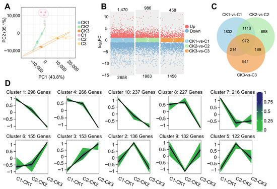 We utilize R (http://www.r-project.org/, accessed on 9 May 2025) to conduct principal component analysis (PCA) to study the distance relationship between samples using dimensionality reduction techniques, as follows: Transfer the target gene to the Gene Ontology (GO) database (http://www.geneontology.org/, accessed on 18 May 2025) to obtain the GO term with significantly enriched genes. Integrate the target gene set with the Kyoto Encyclopedia of Genes and Genomes (KEGG) database (https://www.kegg.jp/, accessed on 19 May 2025). By combining this method with enrichment analysis, the pathways with significant enrichment were screened. Mfuzz clusters based on the Fuzzy C-Means Clustering (FCM) algorithm, two-group trend analysis was performed on the treatment group and the control group. The goal is to calculate the different multiple gene expressions between the treatment trend group and the corresponding control trend group, screen the genes with multiple differences greater than 2 in at least one trend group, and finally take the log2 value of the differences between multiples for trend analysis.