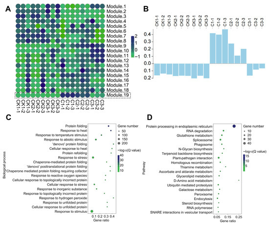 To further clarify the differences in gene expression patterns, 21,902 genes (FPKM > 2) detected by RNA-seq were analyzed by WGCNA. Under the condition of power = 8, 21,902 genes were divided into 19 modules (module 1–19) according to the differences in expression patterns. The maximum module was module 3, with 5836 genes, and the minimum module was module 5, with only 1 gene. We focused on module 19, which was highly expressed in the samples of the treatment group. With the delay in sampling time, the expression showed a continuous downward trend (Figure 5A,B). There were 1403 genes in module 19 which were enriched by GO and KEGG. The results of GO enrichment showed that these were related to the response to a variety of stimuli (such as temperature, reactive oxygen species, etc.) and the protein folding process (Figure 5C). KEGG was significantly enriched in protein processing, a variety of DNA damage repair pathways (such as HR, NHEJ, etc.), and the synthesis and metabolism of a variety of organic substances (such as glutathione, terpenes, sugars, flavonoids, etc.) in the endoplasmic reticulum (Figure 5D). The enrichment results of module 19 were similar to those of the DEGs, which confirmed that module 19 selected in this study was closely related to the gene response process of heavy ion irradiation.