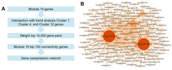 In order to mine the key response genes in response to heavy ion irradiation, firstly, 1403 genes in module 19 were intersected with 801 genes in trend analysis cluster 1, cluster 4, and cluster 10. The weight value in WGCNA reflects the correlation between gene pairs. In order to reduce the complexity of the co expression network, minimize background noise, and preserve almost all biologically significant strong connections, focusing on the most core and reliable co expression relationships, we selected the top 10,000 gene pairs with weight values from the crossover genes. WGCNA module connectivity reflects the importance of genes in the module, and then the top 100 connectivity genes of module 19 were selected. Finally, the gene pairs screened above were mapped into a coexpression network (Figure 6A). According to the coexpression network, Os02g0546600 was at the core of the coexpression network and was associated with the largest number of genes (Figure 6B). Therefore, we believed that Os02g0546600 played an important role in the response of rice pollen to heavy ion irradiation.