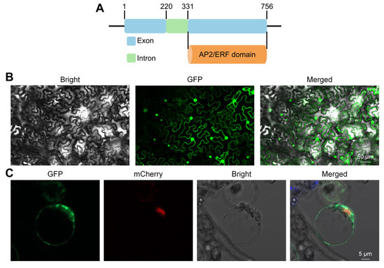 Structure and subcellular localization of OsERF110. (A) The structure of OsERF110. (B) Transient expression analysis of tobacco mesophyll cells. The green fluorescent position is the target transcription factor expression site. (C) Transient expression analysis of rice protoplasts. The green fluorescence indicates the expression location of the target transcription factor and GFP fusion protein, while the red fluorescence indicates the nuclear location.
