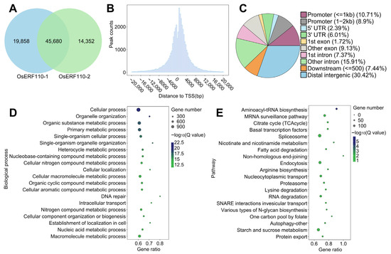 DAP-seq analysis of OsERF110. (A) The number of peaks in two biological replicates. (B) The distance distribution of peaks relative to TSS. (C) The distribution of peaks in the genome. (D) Peaks are located in the GO enrichment of target genes in the promoter region and the top 20 biological processes of −log10 (Q value). The size of the circle indicates the number of genes, and the color indicates the significance level. (E) Peaks are located in the KEGG enrichment of target genes in the promoter region, with the top 20 pathways of −log10 (Q value). The size of the circle indicates the number of genes, and the color indicates the significance level.